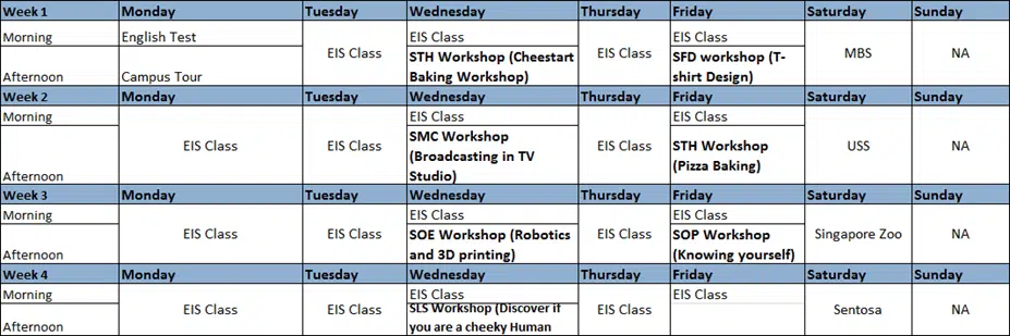Chương trình được thiết kế với 6 giờ học tiếng Anh mỗi ngày (30 giờ một tuần), cuối tuần học sinh sẽ được thăm quan khám phá những điểm du lịch nổi tiếng của Singapore. Đây được coi là một lựa chọn tuyệt vời cho những học sinh tham gia chương trình du học hè Singapore muốn tập trung vào nâng cao các kỹ năng tiếng Anh, trải nghiệm cuộc sống sinh viên thực thụ.